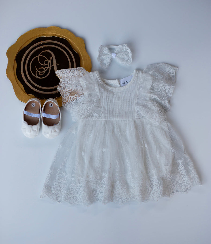 Introducing this gorgeous exquisite white lacey romper dress perfect for christenings,baptisms, or any formal event. Crafted from soft, sheer tulle and fine lace, this romper combines vintage charm with comfortable modern design.